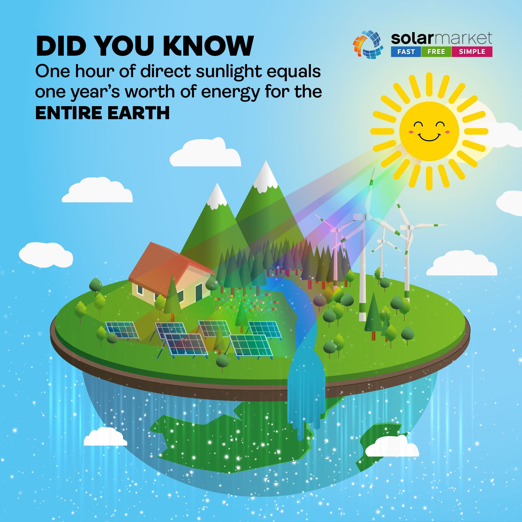 Solar energy is the most sustainable and readily available source of energy on earth. Over 173,000 terawatts of solar energy strike the earth continuously. Just 1 hours-worth of direct sunlight equals one year’s worth of energy for the entire world.